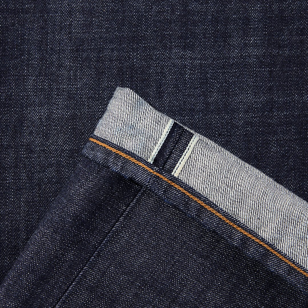 こだわりはセルビッジ(生地の端にある耳)。一般的には赤が多いセルビッジだが、今回は日本のカラーでもあるジャパンブルーをイメージ、しかも生地のロープ染色とは違いセルビッジ部分には綛(かせ)染めしたインディゴ糸を使用している。ロープ染色とは違い芯までしっかり染まっているので、経年変化はしながらも青い色は保ち続ける。